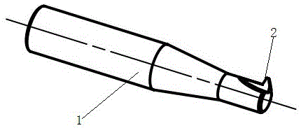 如圖1-2所示,一種整體硬質(zhì)合金刀具,包括圓柱形的刀具本體1和刀尖2,刀具本體1和刀尖2由硬質(zhì)合金制成,刀具本體1左側(cè)為圓柱形、右側(cè)為錐形,錐形直徑不大于圓柱形直徑。